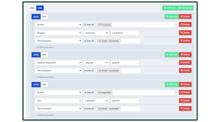 Dankzij de audience builder in Squeezely kunnen we heel eenvoudig geavanceerde doelgroepen maken op basis van gedrag en/of (historische) gegevens van de klant om enkel de personen te bereiken die we willen bereiken. Op basis van de eerder genoemde events kun je precies instellen welke interactie iemand moet hebben op de website om in de doelgroep te vallen.