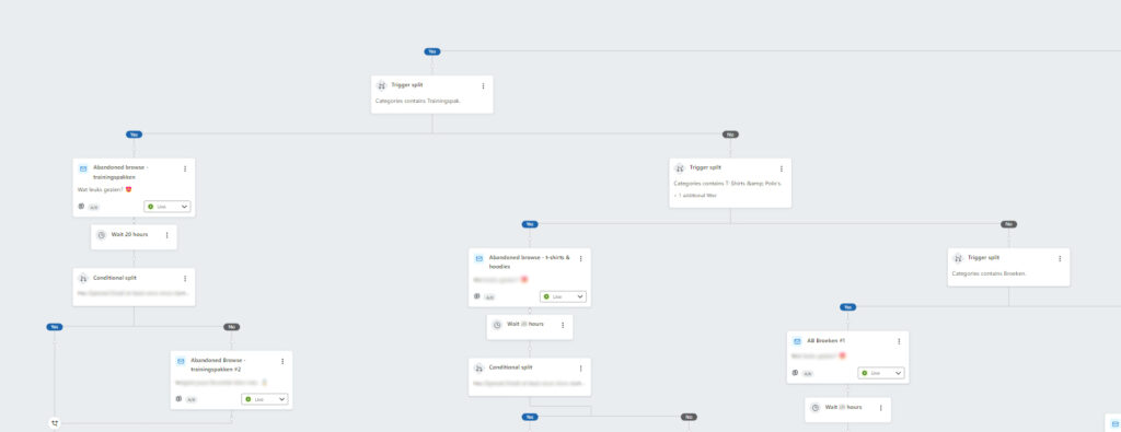Klaviyo biedt een groot aantal integraties, waardoor we relatief eenvoudig gebruik kunnen maken van zowel live- als historische data. Door gegevens uit het CMS en de website te benutten, kunnen we diverse geautomatiseerde e-mail flows opzetten die getriggerd worden door specifieke acties of gebeurtenissen van de klant. Deze integraties stellen ons in staat om nauwkeurig en gericht te reageren op klantgedrag, waardoor de relevantie en effectiviteit van de e-mails aanzienlijk worden verhoogd. Hierdoor kunnen we niet alleen beter inspelen op de behoeften en interesses van de klant, maar ook de algehele klantbeleving verbeteren.